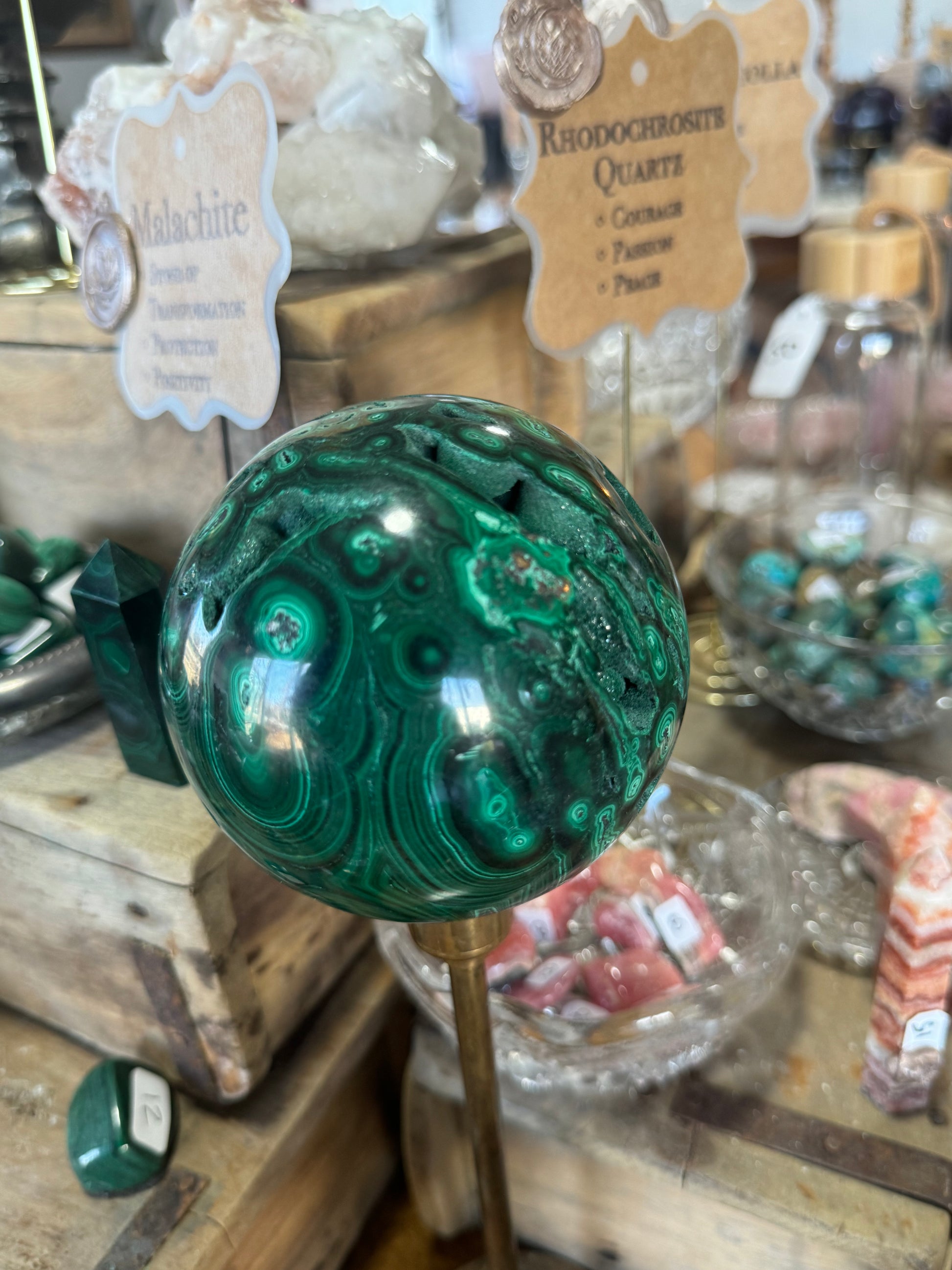 This large malachite sphere is known as the "stone of transformation" because it help reveal and heal emotional pain by absorbing the pain into itself. It brings ease during times of change and gives you insight needed for personal growth.
