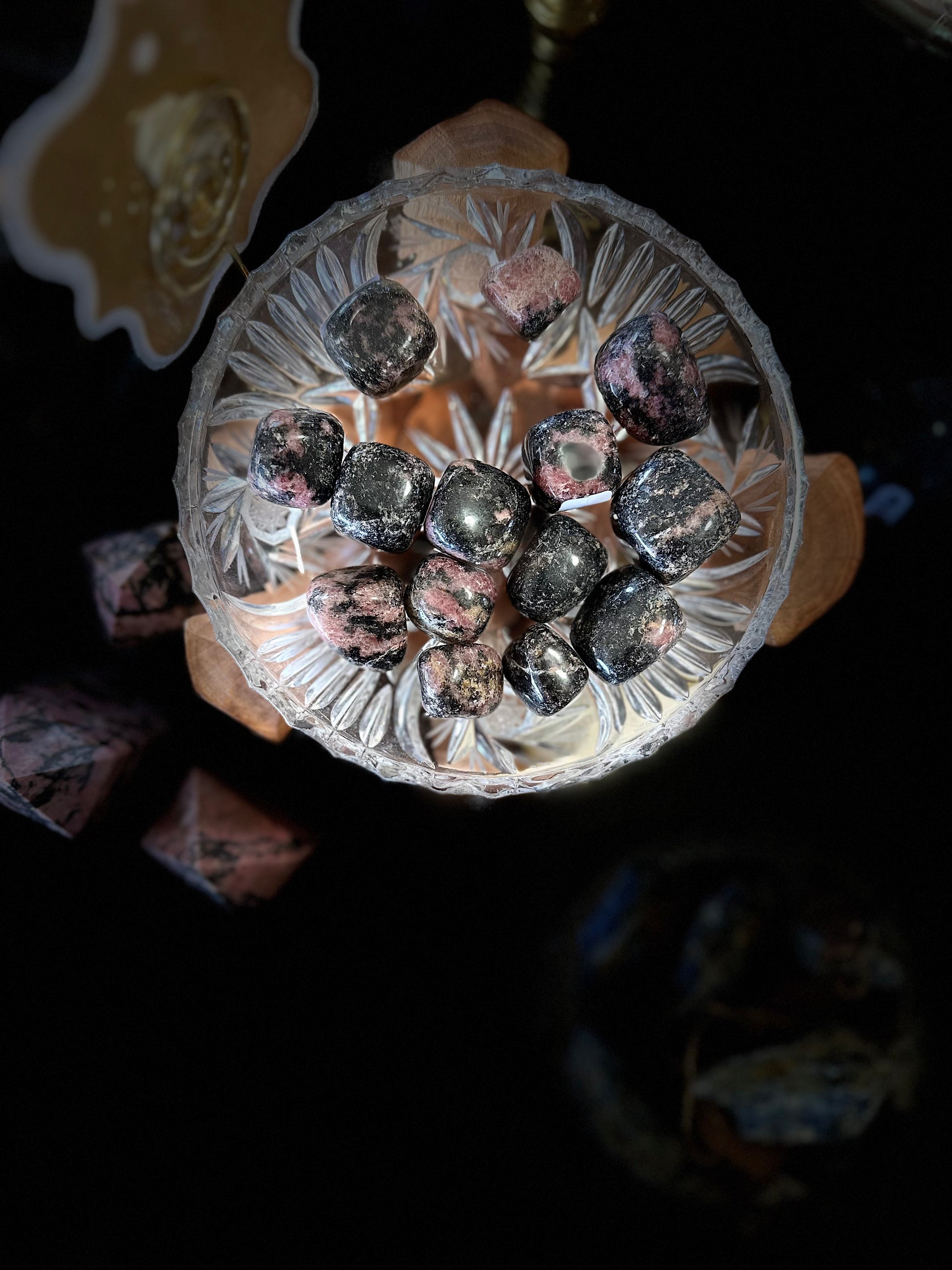 Rhodonite is a stone of compassion, an emotional balancer that clears away emotional wounds and scars from the past, and that nurtures love. It stimulates, clears and activates the heart.