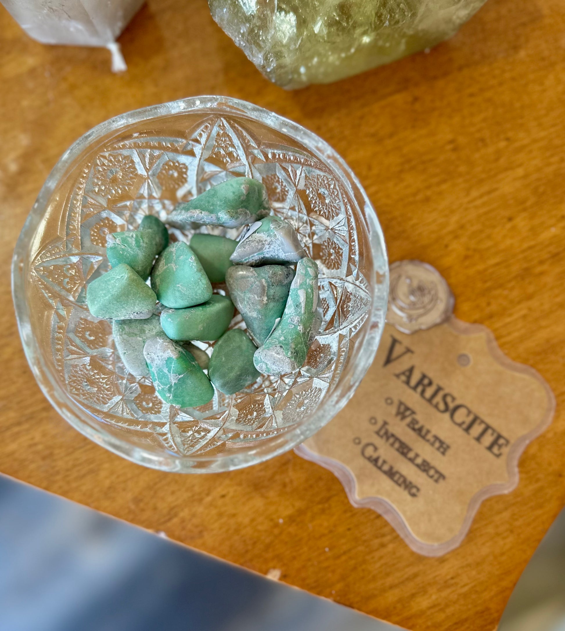 As a green gemstone, variscite is seen as a grounding stone and is associated with the gaining of wealth. Variscite is believed to help brain-related functions, improving intellect and logic.